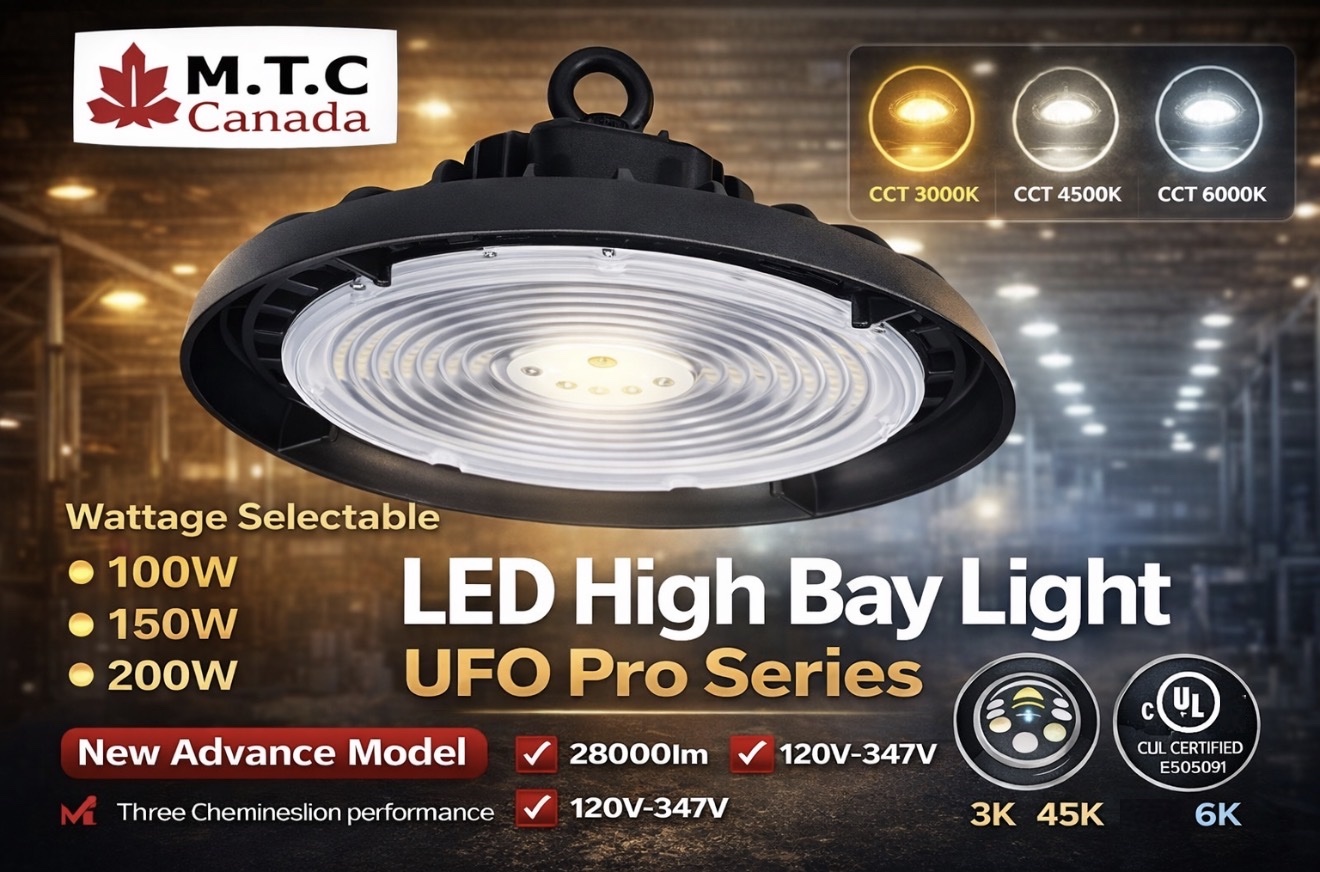 M0809: M.T.C Canada LED High Bay Light UFO Pro series ( Wattage Selectable 200W/150W/100W ) With Button 28000lm And CCT 3K/45K/6K Input Voltage AC120V-347V With New Advance Model CUL certified