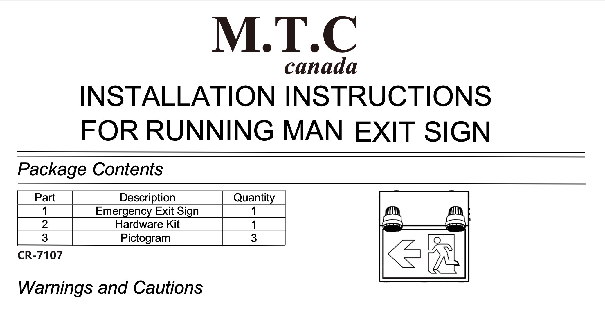 M0665: M.T.C Canada LED STEEL RUNNING MAN EXIT SIGN, Steel Housing Combo Emergency Light Running Man Exit Sign COMBO CSA Certified With 2 Head LED 2Wx2 Input Voltage 120-347V Include 3 Type Running Man Faceplate