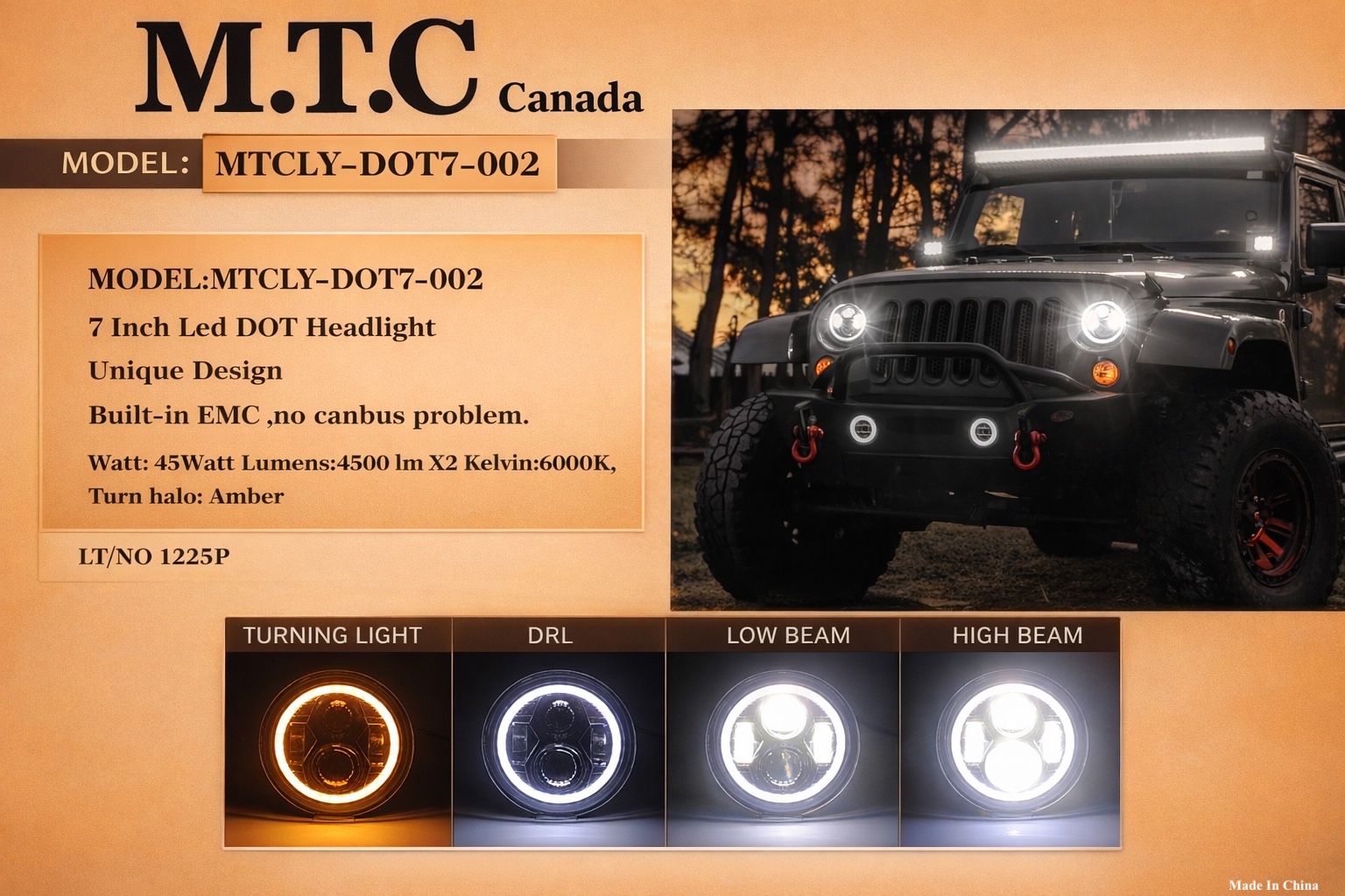 M0369:LED 7 inch Round Headlight with Hi/Low Beam With Halo 6000K And Amber On Turn Signal 45 Watt x2 Luminous:9000lm in Kit Colour Temperature: 6000K (Cool White),Life Span:50,000Hours LED Only DOT,CE,ROHS