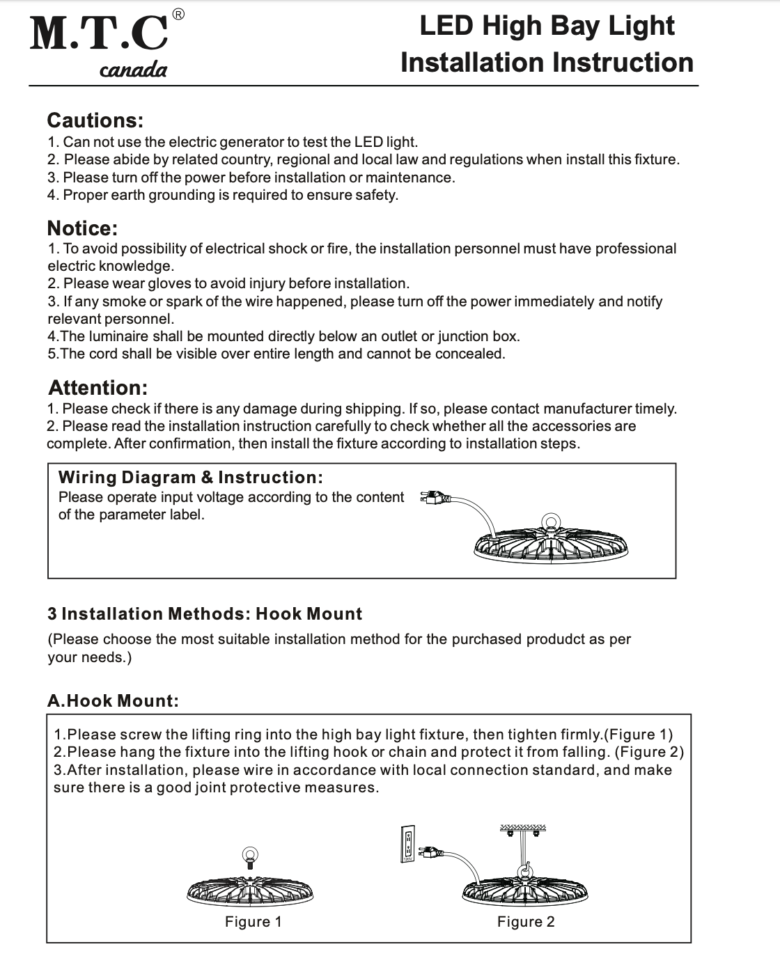 M0836 - M.T.C Canada LED UFO Highbay Light 120VAC With 120VAC Plug in 1.5M Long wire Watt 300W | 42,000 Lumens | Black | CUL Certified