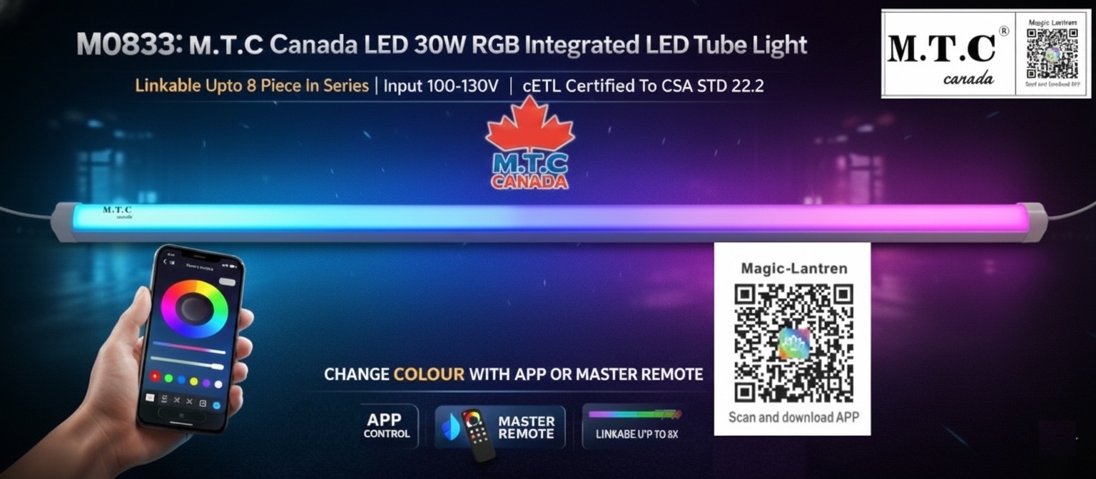 M0833 : M.T.C Canada LED 30W RGB Integrated LED Tube Light Linkable Upto 8 Piece in series Input 100-130V | cETL Certified To CSA STD 22.2 Change Colour With App or Master Remote