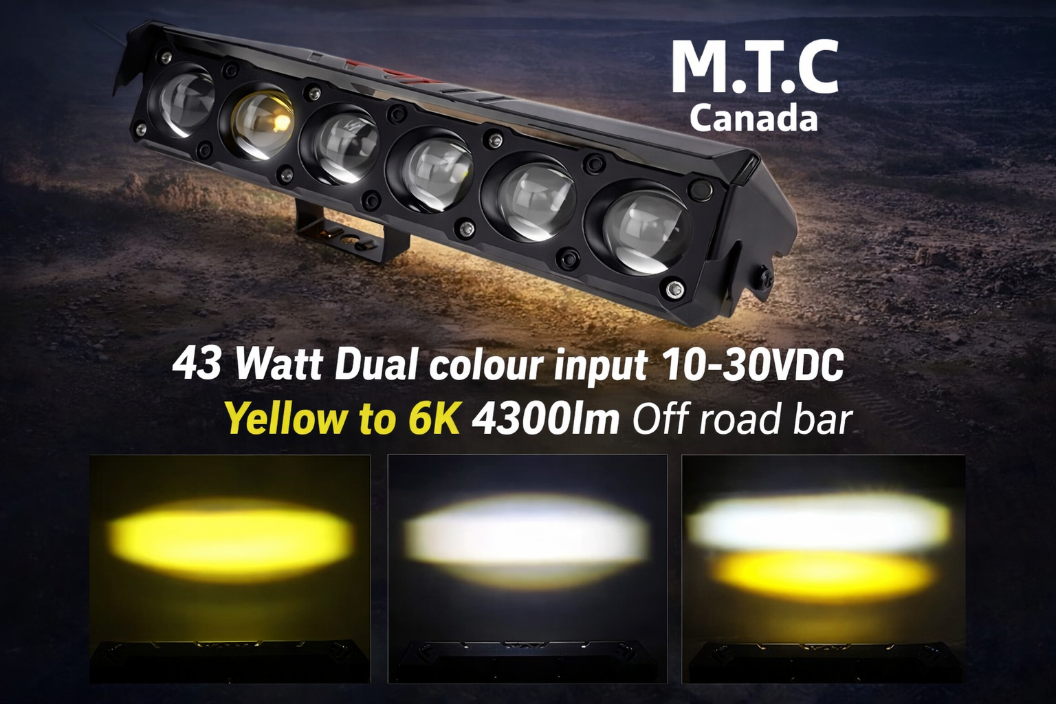 M0850-M.T.C Canada 43W Dual Color LED Light Bar – White 6000K & Yellow 4300lm Off-Road Driving Light, 10-30V DC, IP67 Waterproof, Spot Beam Auxiliary Light