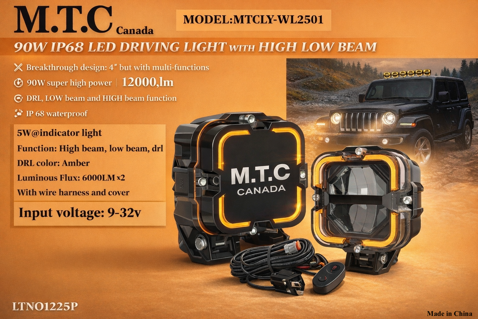 M0854 – M.T.C Canada 4" 90W LED Driving Light with DRL, High/Low Beam, IP68 Waterproof (12000LM, Amber DRL)