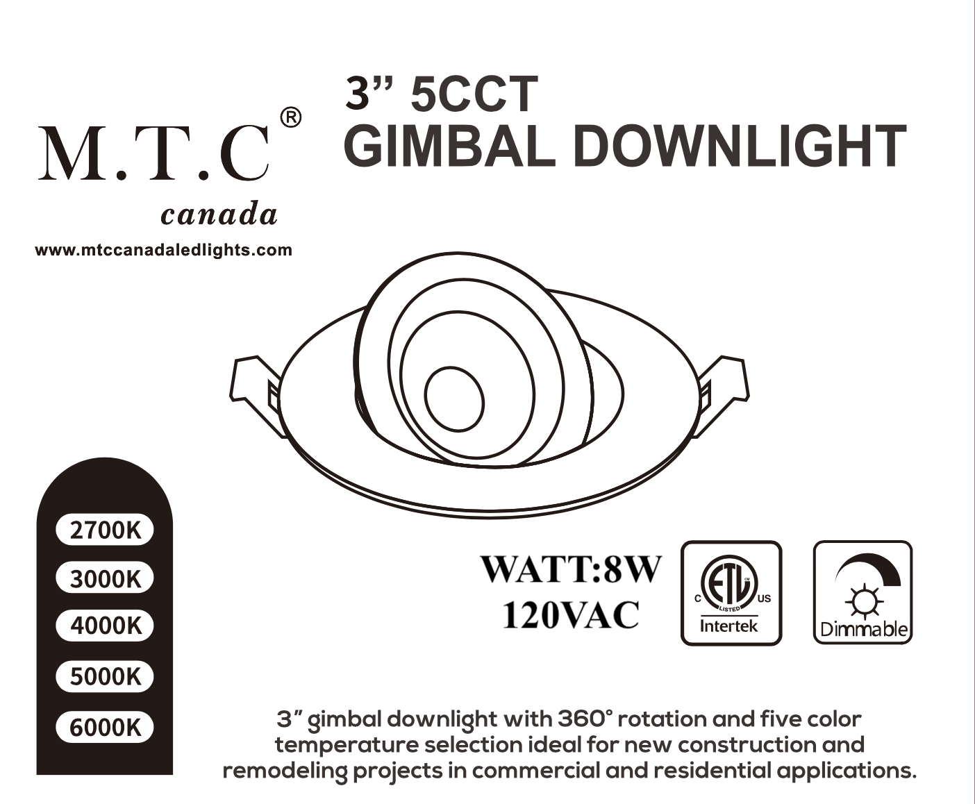 M0839-MTC Canada 3" 8W 800lm 5CCT(27K-6K) Adjustable Gimbal LED Downlight – 360° Rotation, Triac Dimmable, 120V Dimmable, Cetl Certified