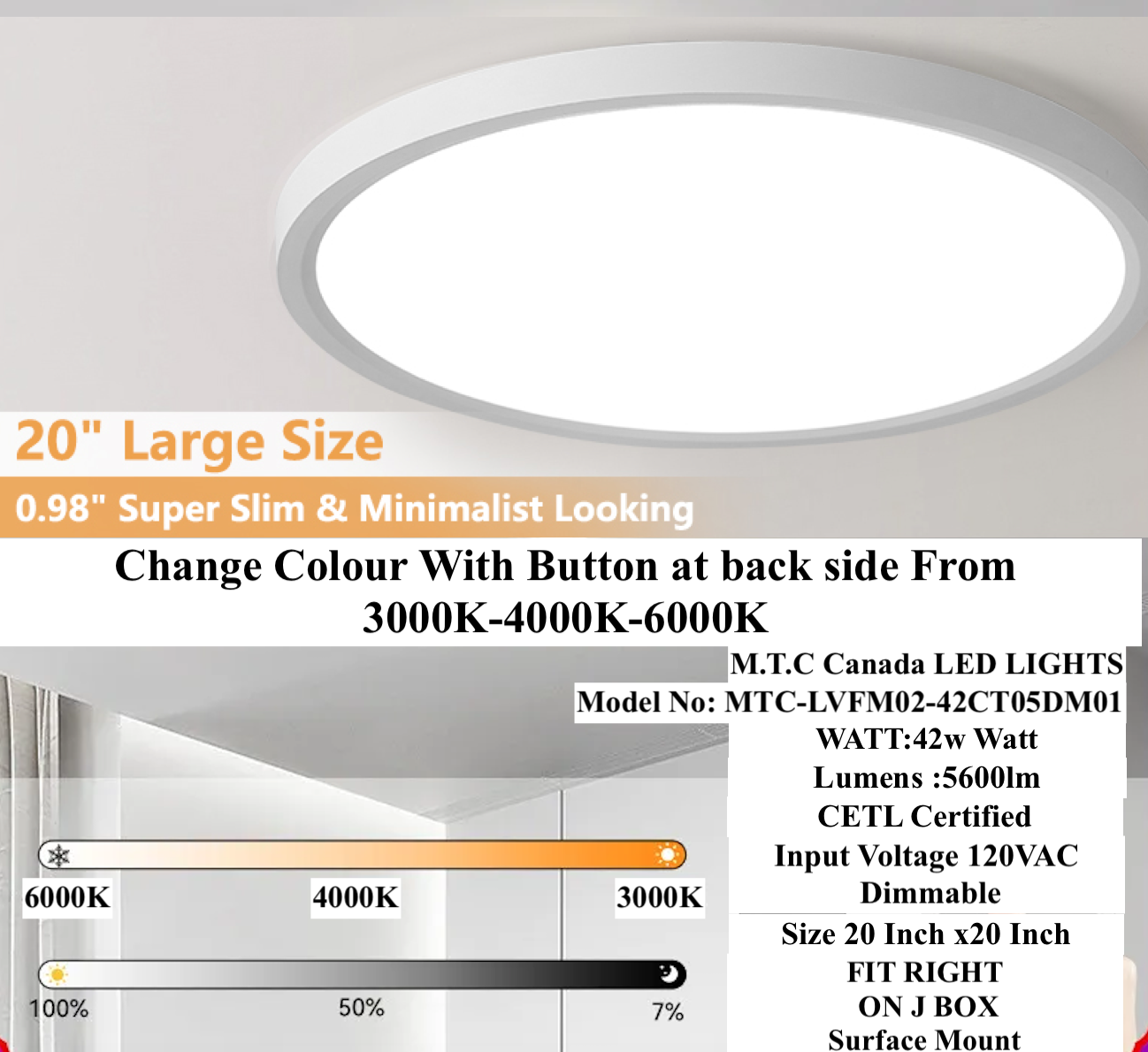 M0841: M.T.C Canada 20 Inch Round Ceiling Light Surface Mount 42 Watt 3cct 3K-4K-6K 120VAC Dimmable 5600lm CETL Certified