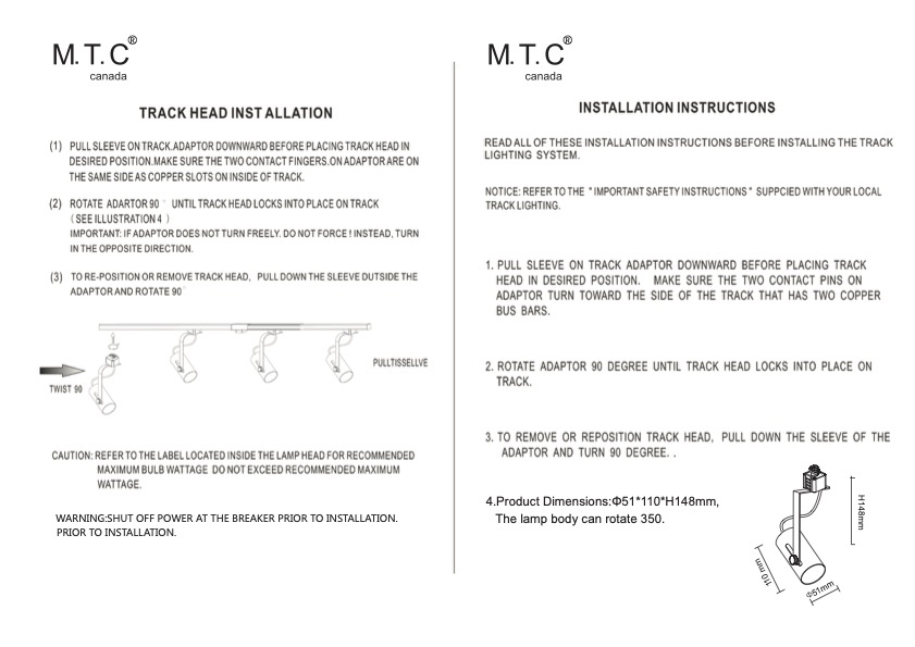 M0236/W M.T.C Canada 2 Pin L Type And 3 Pin H Type Track Head 120VAC With E26 Holder CETL Certified White Housing , Can Use With PAR/BR/ R Type Lamp