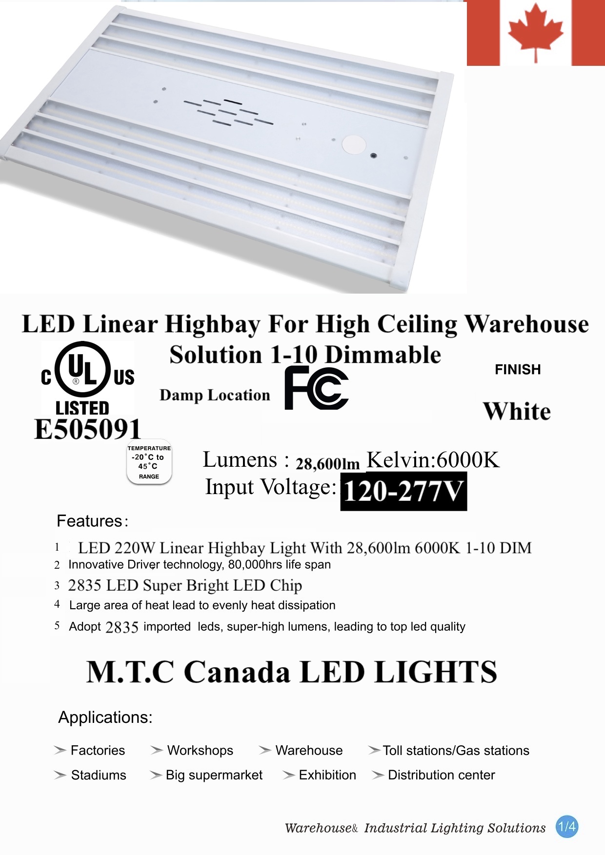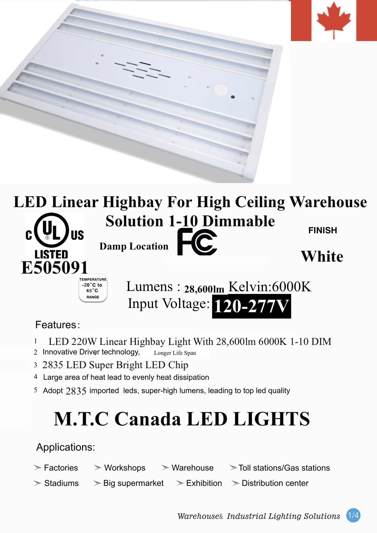 M0310 : M.T.C Canada LED Linear High Bay Light 220W 28600lm 6000K 0-10 V DIMMABLE CUL Certified
