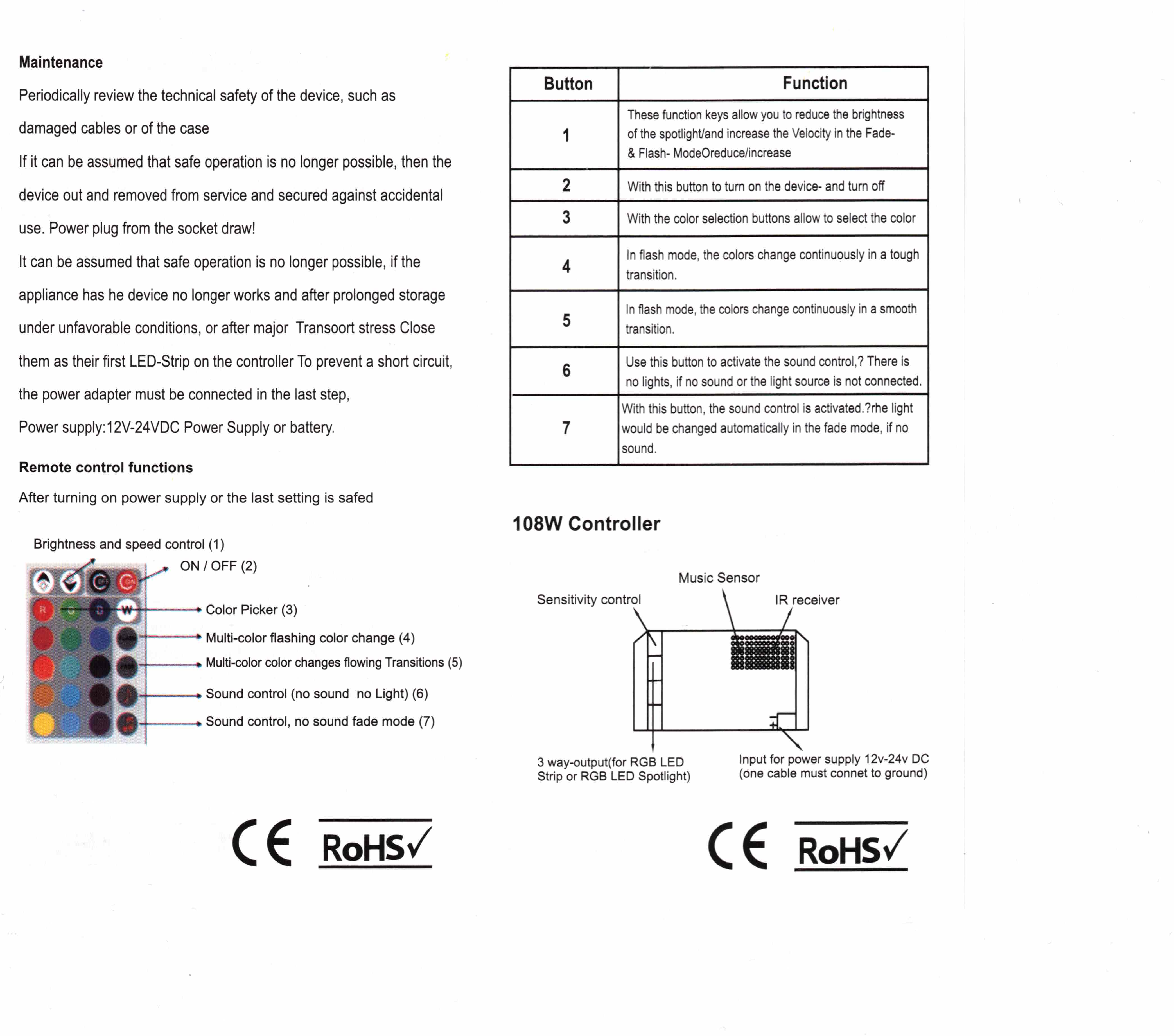 M0395 : M.T.C Canada Music LED Controller For RGB 12v/24V DC Strip Lights Input Voltage 12/24VDC CE With Remote Controller