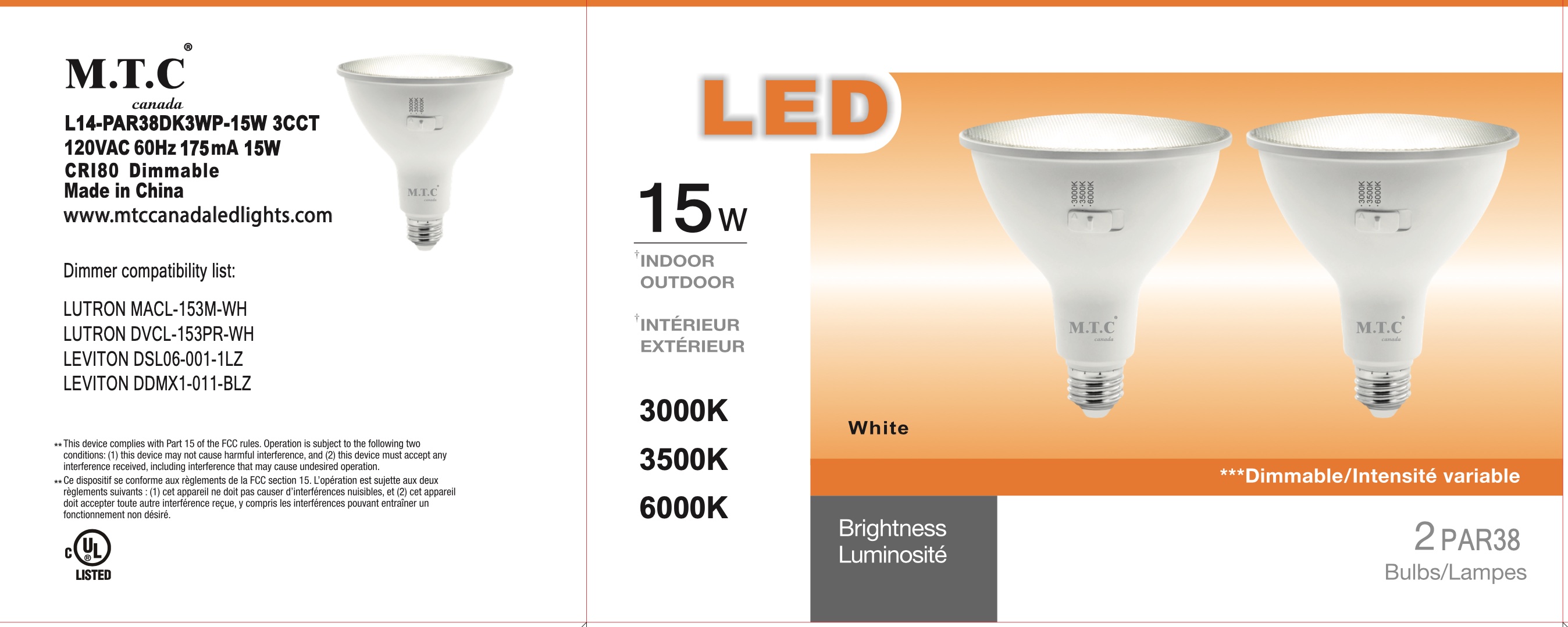 M0587- M.T.C Canada ® LED Par 38 3CCT With E26 Holder
