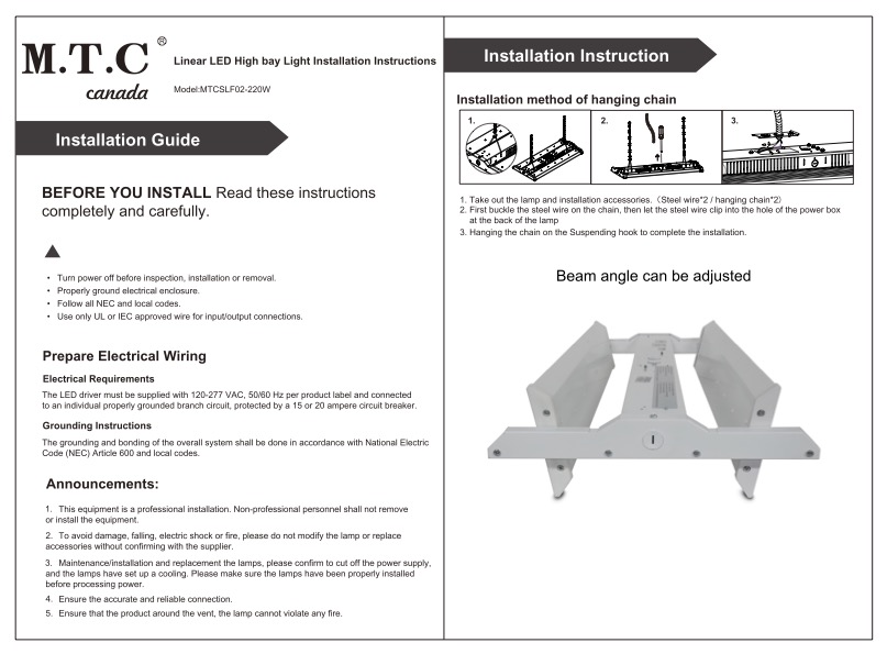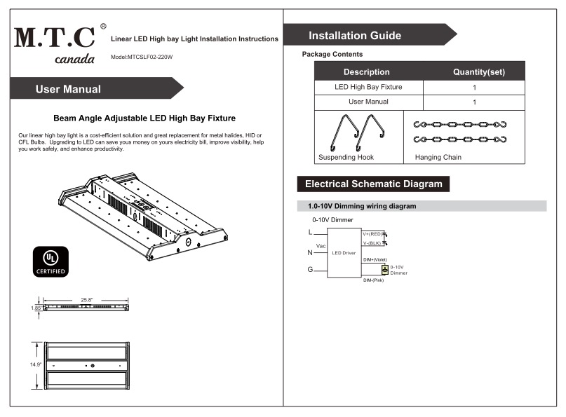 M0637: M.T.C Canada LED Linear High Bay /High Ceiling Warehouse Lights Adjustable Input Voltage 100-277VAC 220W 28,600lm 6000K Cul Certified