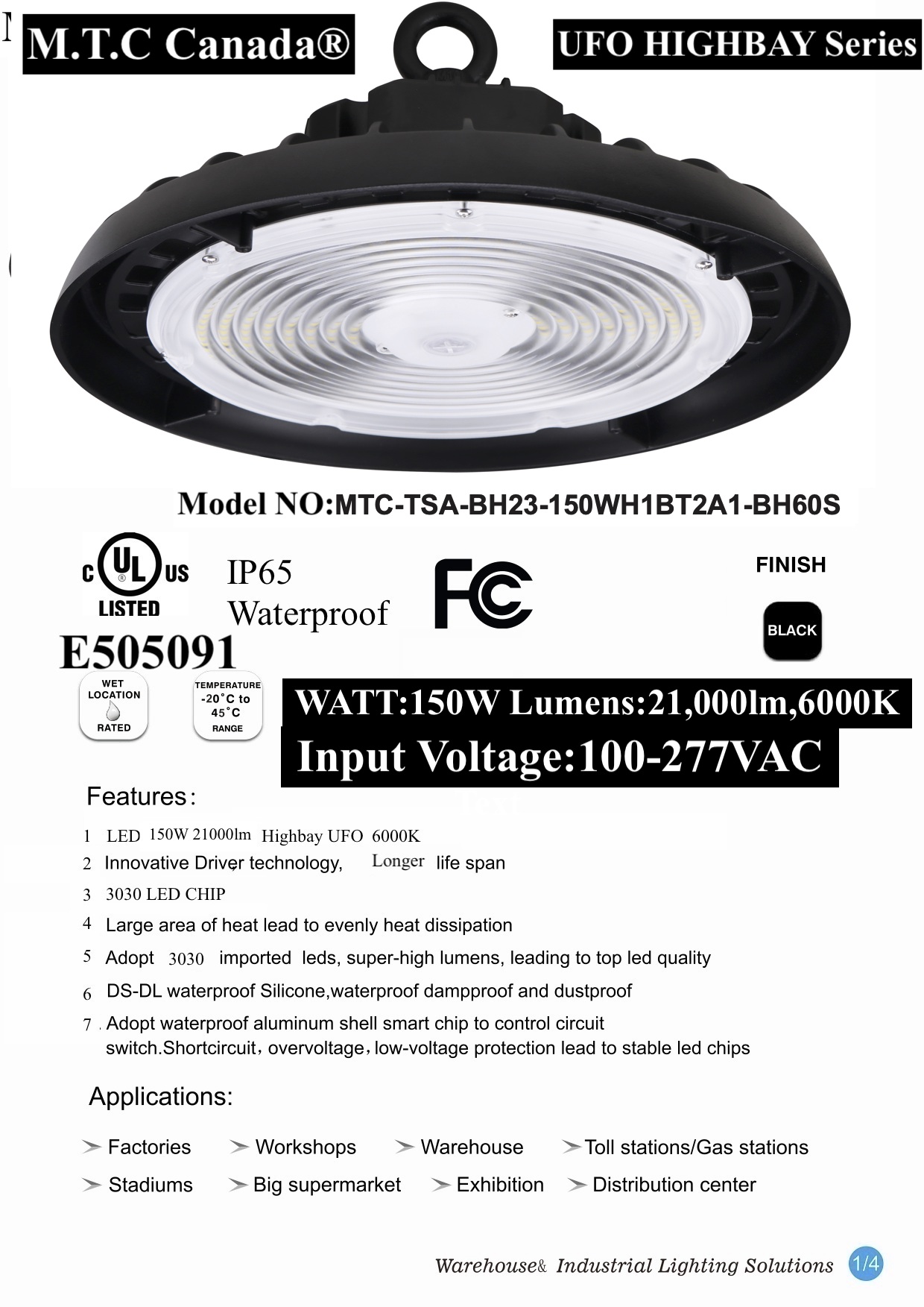 M0709: M.T.C Canada LED High Bay Light UFO Pro series 150W 21000lm 6000K Input Voltage AC100V-277V With New Advance Model CUL certified