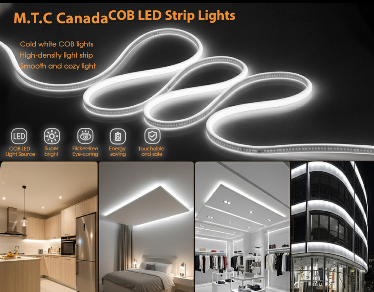 Illuminate any space with professional-grade brilliance using the M.T.C Canada M0828/6K LED COB Line Voltage Strip Light. Designed for both indoor and outdoor applications, this 50-meter (165 ft) continuous roll provides powerful, seamless lighting with 480 high-density COB LEDs per meter.