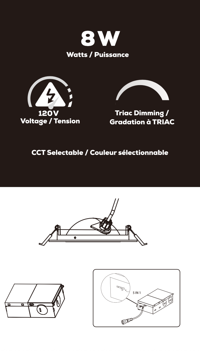 With integrated 5CCT selectable color temperature (2700K–6000K), you can easily customize the ambiance during installation. Operating at 120V and compatible with TRIAC dimmers, it offers smooth and reliable dimming performance.