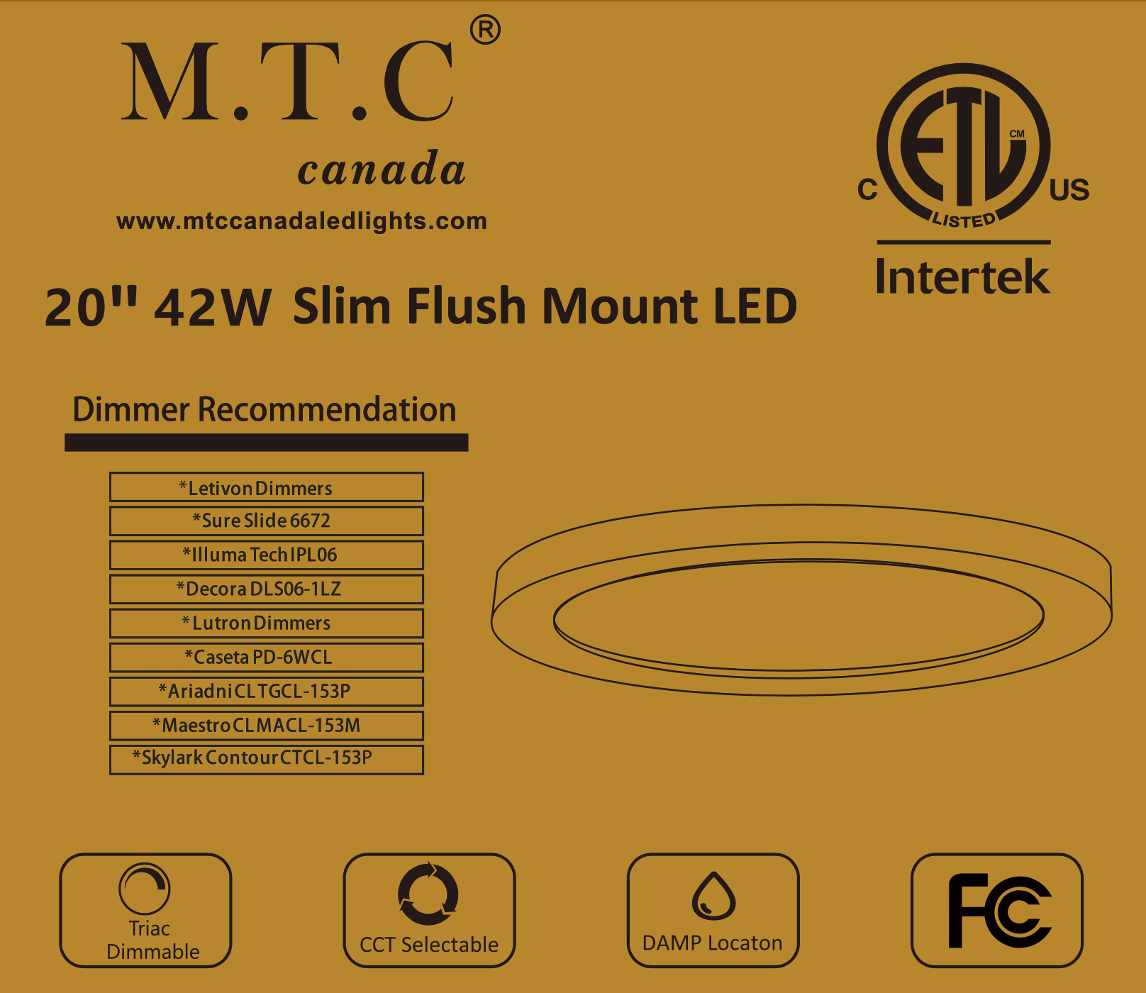 M0841: M.T.C Canada 20 Inch Round Ceiling Light Surface Mount 42 Watt 3cct 3K-4K-6K 120VAC Dimmable 5600lm CETL Certified