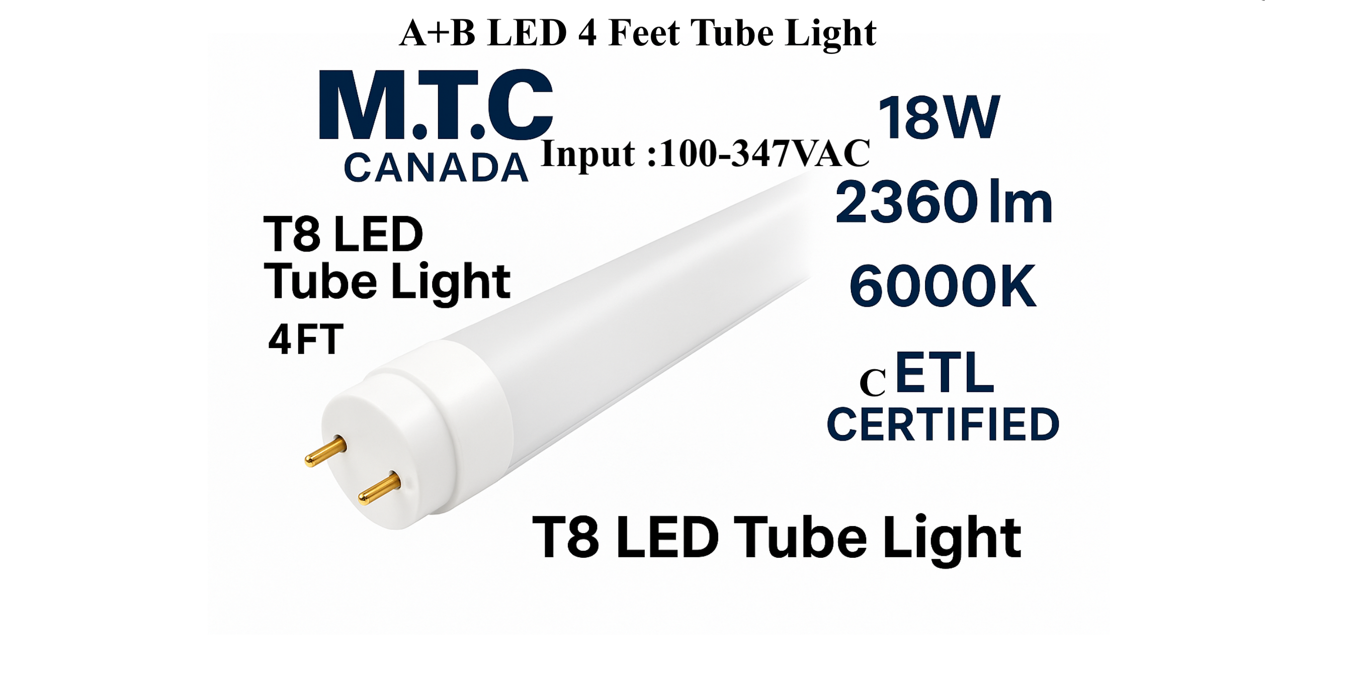 M0803 : M.T.C Canada T8 4FT LED Tube Light – 18W, 6000K, LED T8 4 feet 2360 lm Input 100-347VAC Frosted, Type A+B, CETL Certified