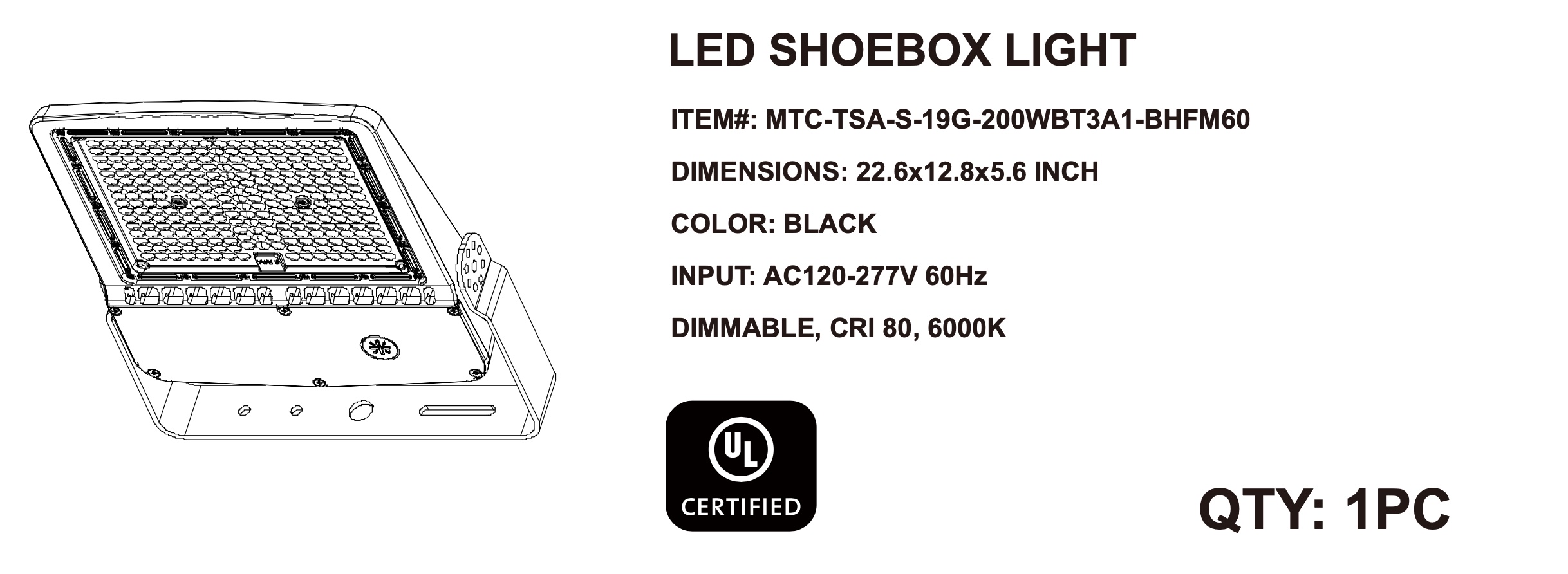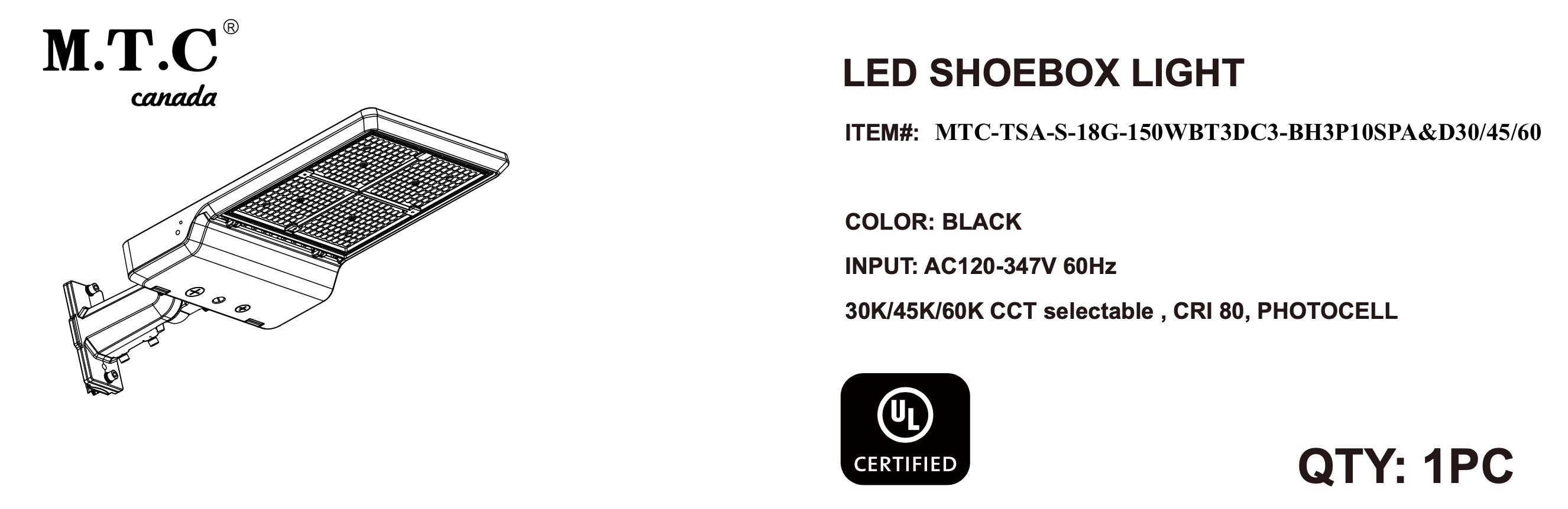 M0725 : M.T.C Canada LED Shoe Box 150W Premium New Advanced Model 21000lm 3cct 3000K/4500K/6000K Bright White Waterproof IP65 Indoor/Outdoor, Input Voltage 100-277VAC/347VAC With Photocell Sensor CUL