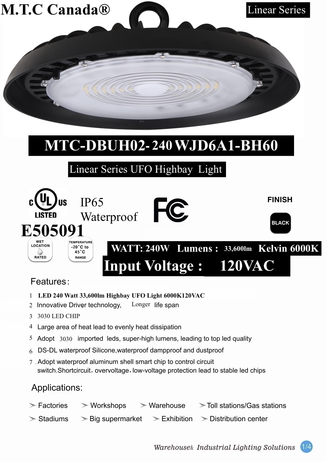 M0776 : M.T.C Canada LED High Bay Light Linear UFO Series 240W 33,600lm 6000K Input Voltage 120VAC IP65 Waterproof / Dust Proof New Advance Model CUL certified