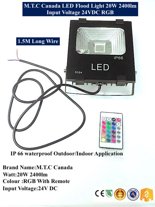 M0335 :M.T.C Canada LED Flood Light 20W Input Voltage 24V DC RGB 2400lm With Remote Control IP66 , Waterproof Outdoor /Indoor application CE,ROHS