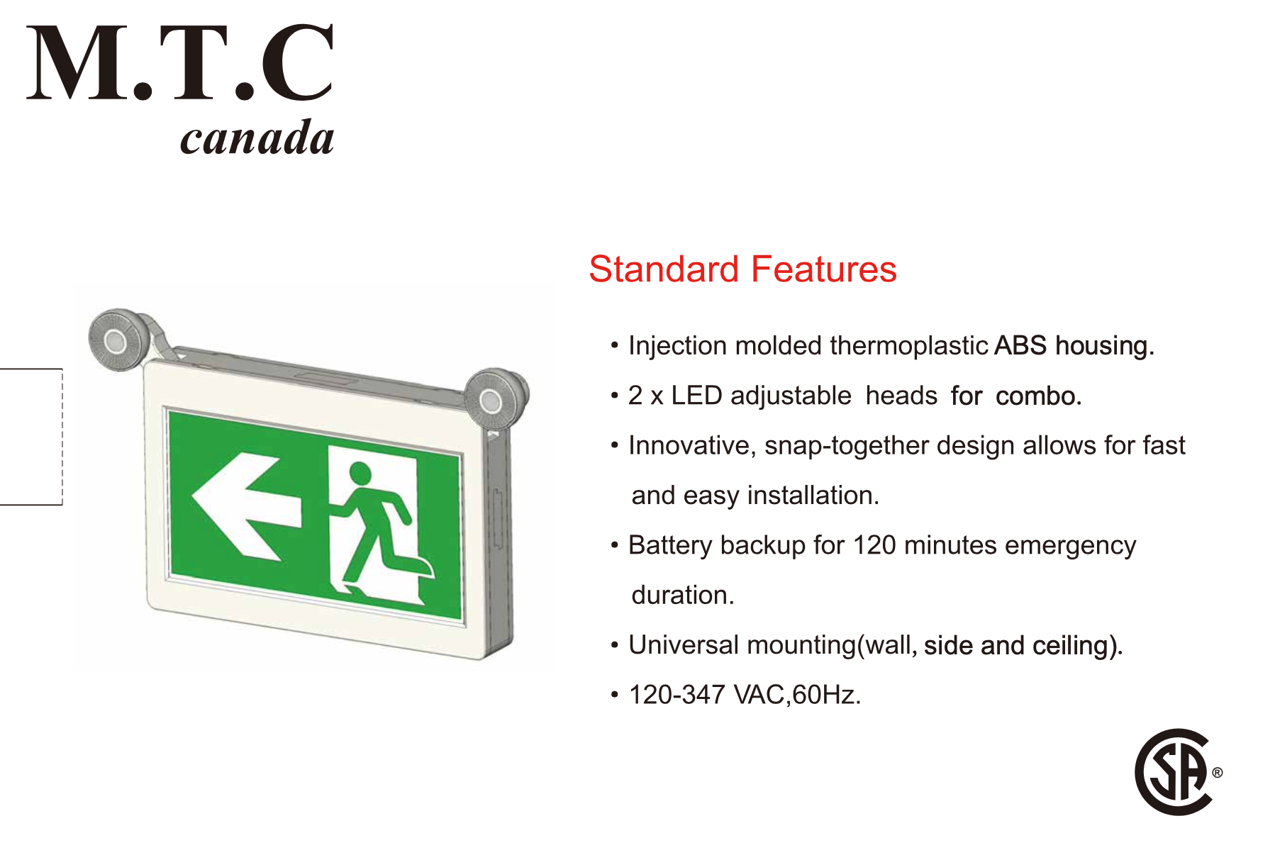 M0332: M.T.C Canada LED Plastic RUNNING MAN EXIT SIGN COMBO CSA Certified With 2 Head Ultra Bright 6500-7500K Input Voltage 120-347V Include 3 Type Running Man Faceplate